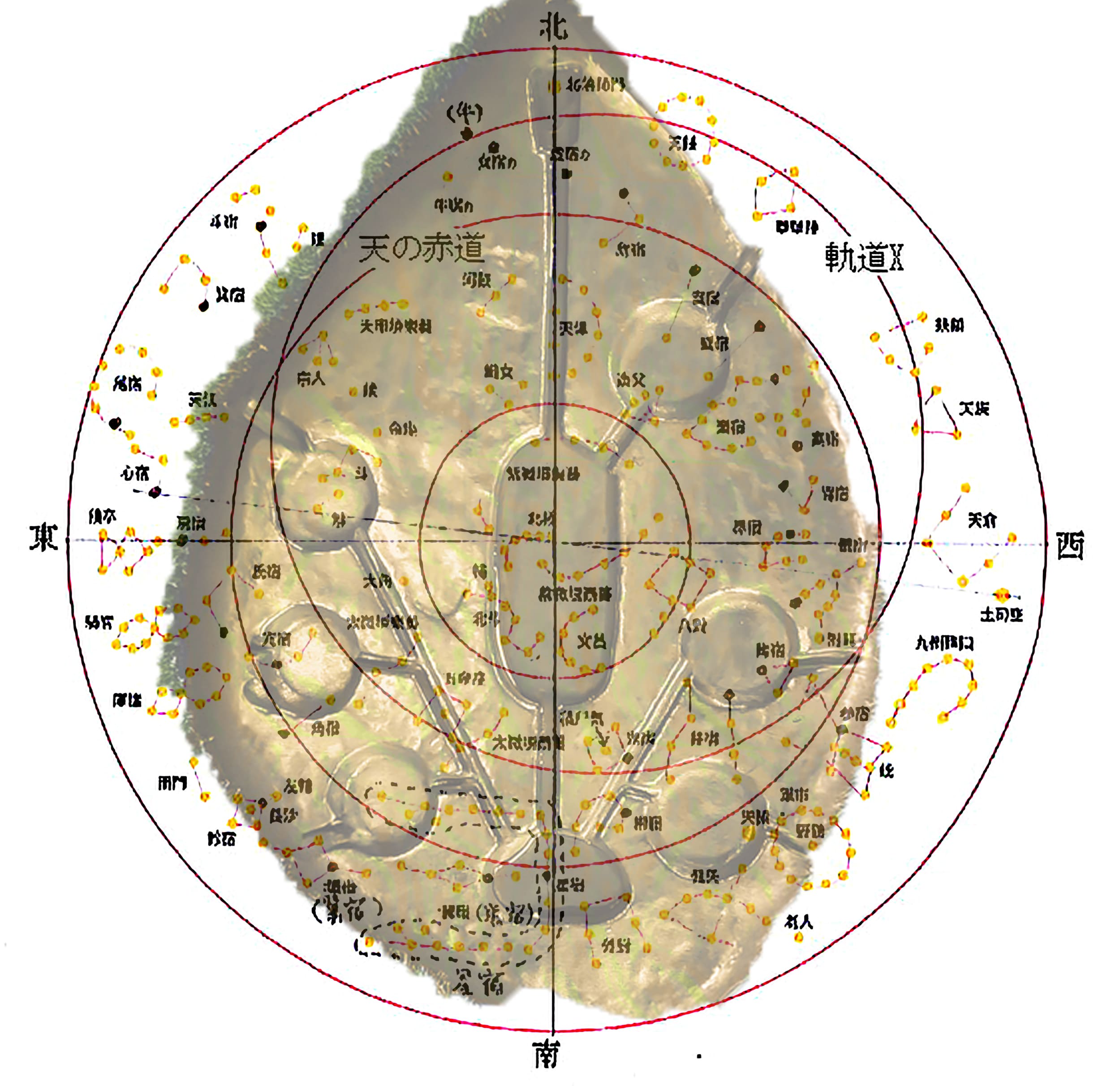 キトラ古墳に描かれた天文図の星座と酒船石とを重ねると下のようになります。